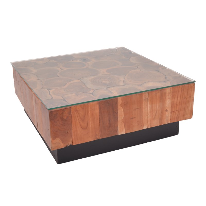 Холна маса орех-черно тиково дърво масив-стъкло 80x80x32см