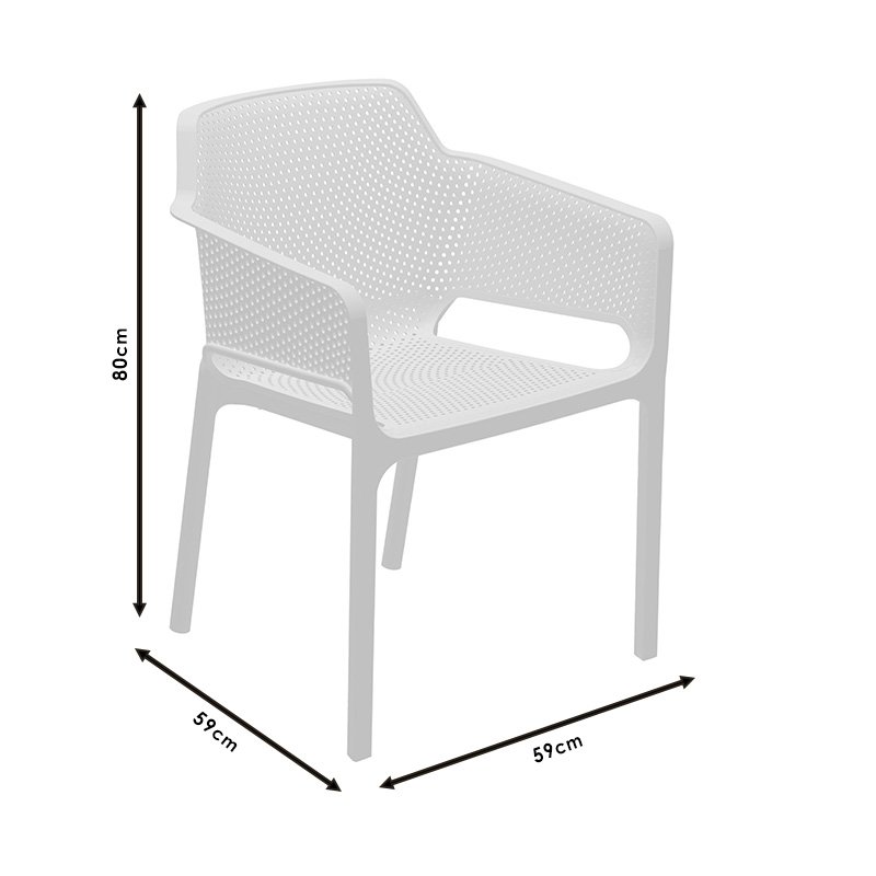 Идеалната комбинация от качество и комфорт го превръщат в необходим аксесоар за всяко пространство. Спецификации:* Изработен от висококачествен перфориран полипропилен (PP).* Издръжливост: Полипропиленът е материал с голяма устойчивост на условията на външната среда (излагане на влага, въздух и др.). Може лесно да се почиства с влажна кърпа или течаща вода и е екологично чист рециклируем материал.* Има подобрен UV слънцезащитен филтър за продължително излагане на слънце и външни условия.* Подрежда се един върху друг: Предлага лесен транспорт и съхранение. Което го прави идеален за заведения за обществено хранене и бизнес помещения.* Предлага се бял цвят Размери на продукта: Дължина: 59 см Ширина: 59 см Височина: 80 см Височина на седалката: 46 см Забележки: Продуктът се доставя сглобен във фабричната си опаковка. Цветът на продукта може леко да се различава от фотографското му представяне на вашия екран.