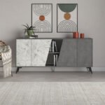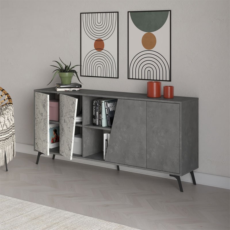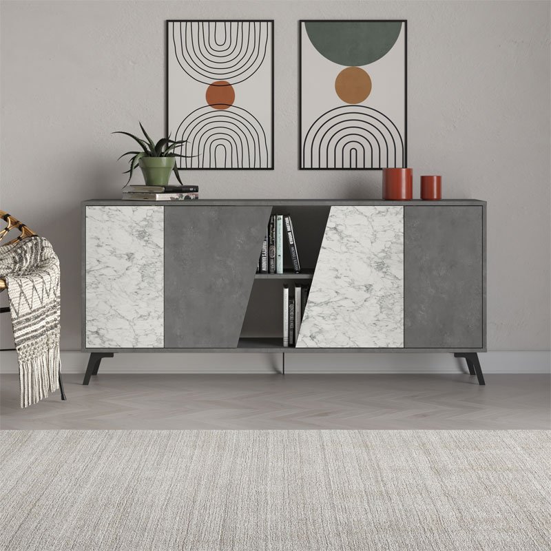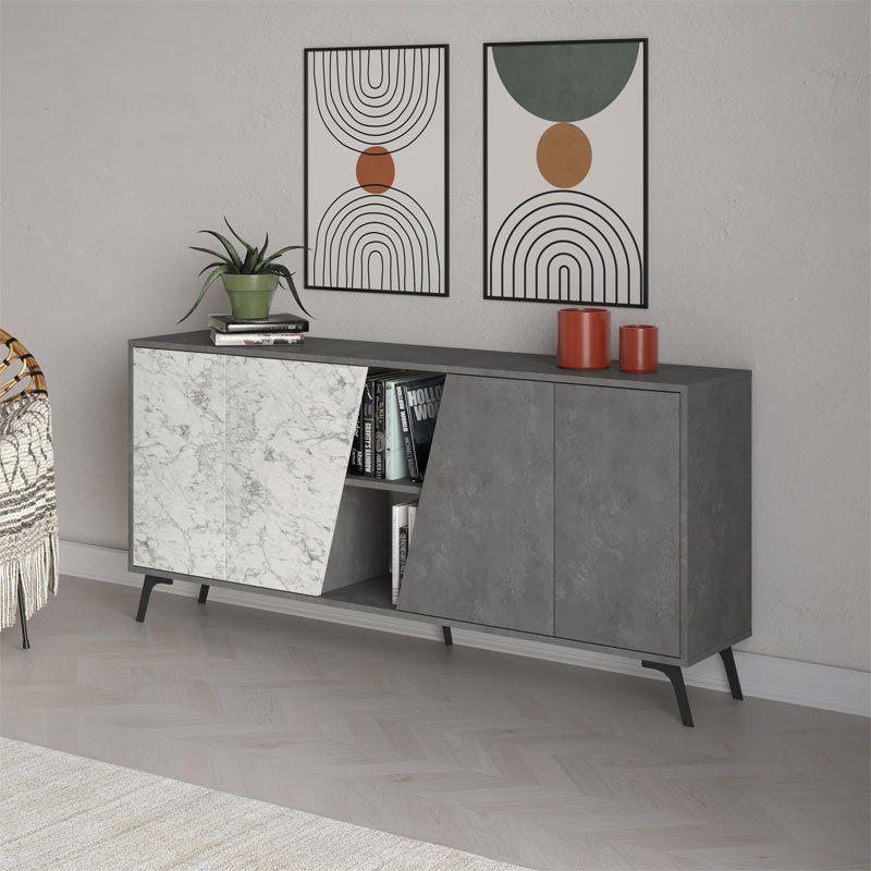 Бюфет Hana модели антрацит антично-бял мрамор 180×35.5x82см Обичате ли семпли форми, класически дизайн и мебели, които могат да се впишат удобно във всяко пространство? Ако е така, бюфетът Hana ще допълни естетиката на вашето пространство, като същевременно ви предлага допълнителни пространства за показване и съхранение на предмети. Стилно предложение за декорация за вашата всекидневна или хол. Спецификации:* Изработен от ПДЧ с висококачествено меламиново покритие, устойчиво на натоварване и време в цветова комбинация антично антрацит-бял мрамор.* Включва шкафове и два рафта за съхранение на предмети, аксесоари и др.* Опората върху черни метални крака елегантно подчертава цялостта.* Със система за отваряне с натискане за шкафовете.* Максимална устойчивост на тегло от 40 кг Размери на продукта: Дължина: 180 см. Ширина: 35.5 см. Височина: 82 см. Забележки: Продуктът се доставя несглобен, във фабрична опаковка и с подробно ръководство за монтаж. Цветът на продукта може леко да се различава от фотографското му представяне на вашия екран.