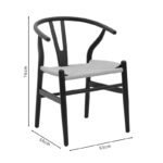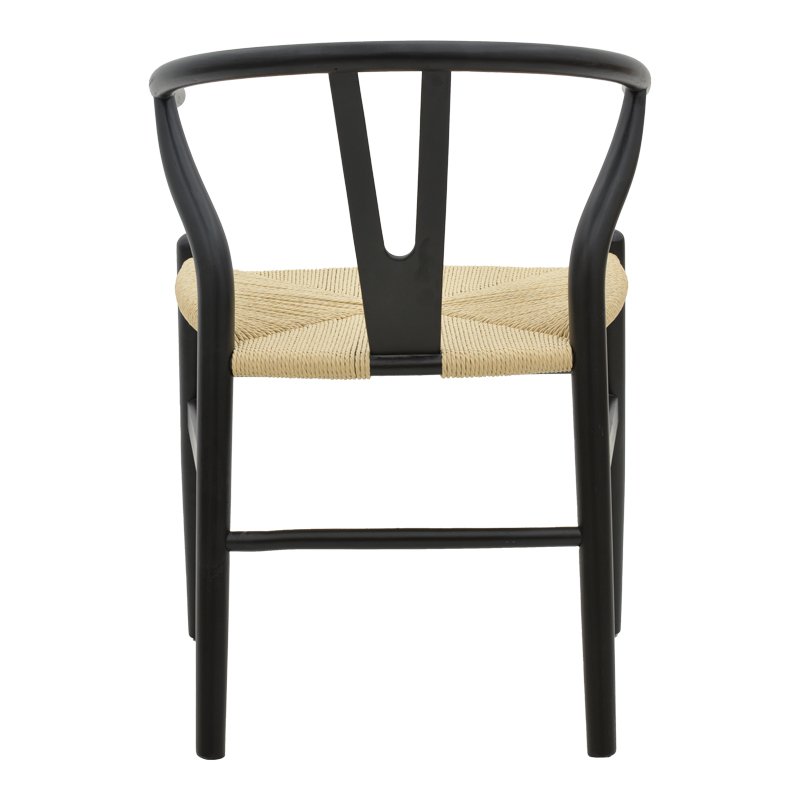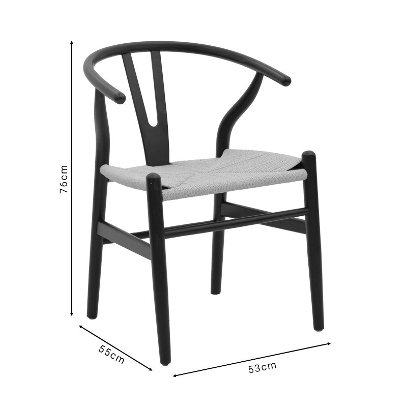Made of natural beech wood, it is a flexible and durable structure, ideal for the dining room as well as the living room of your home.Specifications:*Made of beech wood. Beech wood comes from the beech tree, a deciduous tree native to Europe and Asia. It is one of the most common hardwoods in Europe and is valued for its hardness, durability and beauty. It has a light brown to cream color with a fine, uniform texture. It has tight pores and barely visible water, giving it a clean, sleek look. Beech wood is also very hard and durable, making it a good choice for furniture and flooring that will stand up to heavy use. Beech wood is easy to cut, shape and finish, making it ideal for furniture and other construction.* Seat made of extremely durable rope that makes it suitable for daily use.* The ends of the legs have protective plastic covers to protect the floor from unwanted damage.* Offered in black-natural color.Product Dimension:Length: 53 cmWidth: 55 cmHeight: 76 cmRemarks:The product is delivered assembled in its factory packaging. The color shade of the product may differ slightly from the photographic representation on your screen.