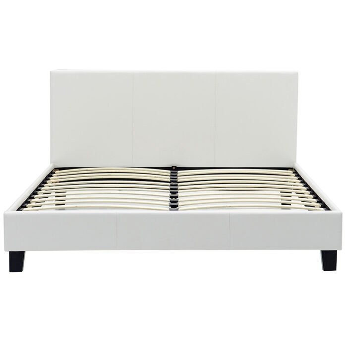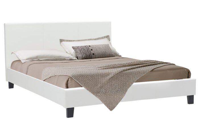 Double bed Nevil modeliny PU white matte 150x200This bed has a minimal style. It has qualitative construction and its design suits in any decoration.Technical Specification: Made from reinforced wooden frame and upholstered 100% with high-quality PU leather, providing durability and easy cleaning. Offered in white matte color. Bed Features: Equipped with anatomical slats, providing a comfortable and restful sleep. Headboard: Features reinforced stitching in a square design, giving a minimal aesthetic. Legs: The base is supported by 4 reinforced elevated legs, allowing for easy cleaning under the bed. Compatible Mattress Size: 150×200 cm (mattress not included).Product Dimensions: Length: 156 cm Width: 212 cm Height: 87 cmDistance Between Slats: 9 cmMaterial Information: Natural Wood: Natural wood comes from a wide variety of trees, each with its unique characteristics. Common types include pine, beech, oak, etc. PU Leather (Upholstery): PU is an imitation leather, typically referring to polyurethane, a material widely used across various sectors due to its excellent properties. It has satisfactory durability, is easy to clean, waterproof, non-deformable, and environmentally friendly.Maintenance Instructions: Natural Wood: Proper maintenance is essential to preserve the beauty, durability, and longevity of natural wood. Use a soft, damp cloth to wipe the wood. Avoid using harsh chemicals or abrasive cleaners, as they can damage the finish. PU Leather: Use a soft cloth to remove any dust from the surface. For stains, use lukewarm water and mild soap to clean the area. Always dry the surface afterward with a dry cloth to prevent water marks.Remarks: The product is in factory packaging with a detailed assembly guide. The color shade of the product may slightly differ from its photographic depiction on your screen.