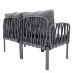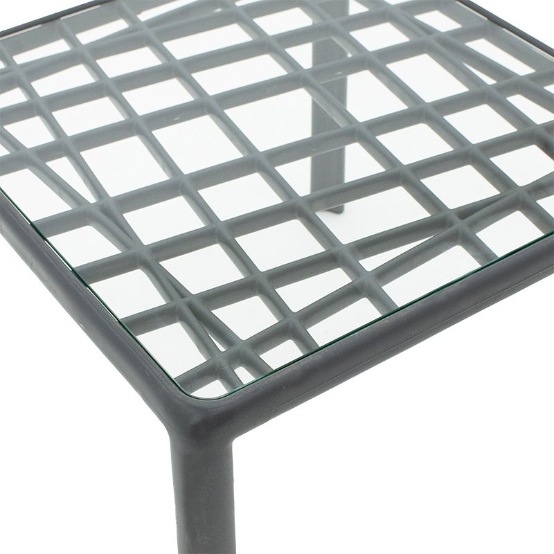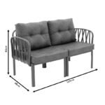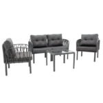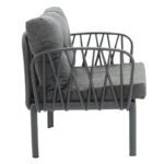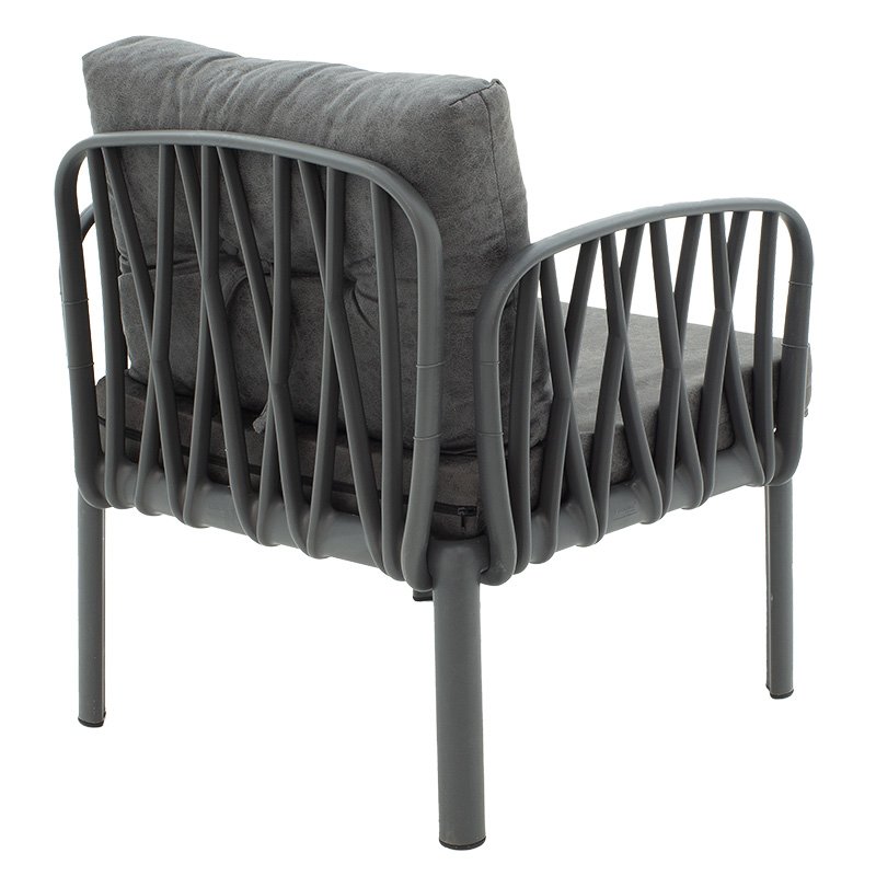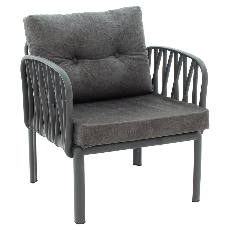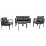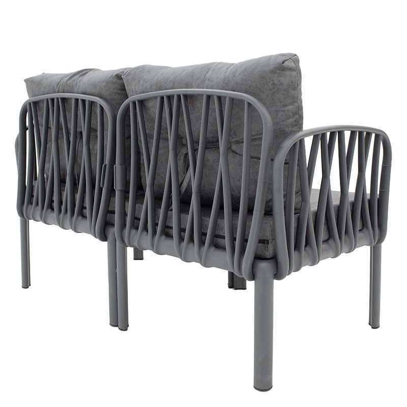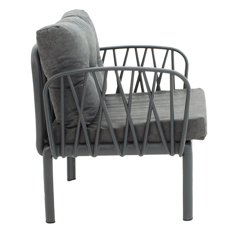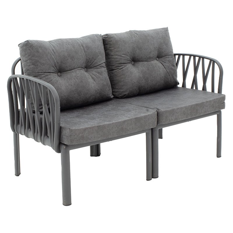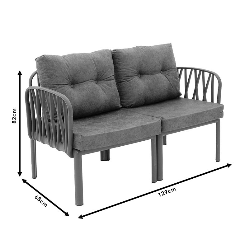 The ideal combination of quality and comfort turn it into a necessary accessory for every space.Specifications:* Made of high quality perforated polypropylene (PP).* Durability: Polypropylene is a material with great resistance to the conditions of the external environment (exposure to moisture, air, etc.). It can be easily cleaned with a damp cloth or running water, and it is an environmentally friendly recyclable material.* It has an enhanced UV sun protection filter for prolonged exposure to the sun and outdoor conditions.* Offered in charcoal frame and antique charcoal cushions* The cushions are zipped and the covers are removable.* The table has transparent safety glassProduct dimensions:2-seat sofa: 129x68x72.5/82 cmTwo armchairs: 66x68x72.5/82 cmA table: 60x60x44 cm.Other dimensions:Seat height: 42 cmSeat depth: 68 cm / 40 with cushionThickness of foam seat: 8 cmThickness of foam back cushion: 16 cmRemarks:The product is delivered in its factory packaging. The color shade of the product may differ slightly from its photographic representation on your screen