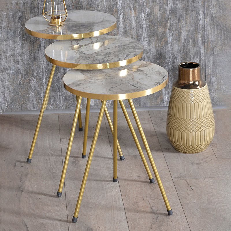 Click Here to download the Product Assembly Instructions.Weber modeliny side tables set of 3 white marble gray-goldIf you are looking for coffee tables to give style to your space or to create original decorative compositions, then Weber are ideal for you. Elegant, simple but at the same time tasteful, they will breathe new life into your space.Technical Specifications: Stable frame made of metal of excellent quality and mainly chipboard surface with melamine coating resistant to wear and time. The round shape on the surface will give new life to your decoration. They have plastic protectors on the legs to protect the floor from unwanted damage. They are offered in white gray color with marble imitation around the perimeter with a golden band PVC and legs in golden color. Unique shade of marble: variations in the color tone of the waters may be observed in relation to the photographic representation of the product.Product Dimensions: Dimensions of a large table: 34x34x52cm high. Dimensions of the middle table: 34x34x49cm high. Small table dimensions: 34x34x46cm high.Material Information: Chipboard: Chipboard is a composite wood material made from small wood particles, typically pine or fir, bonded together under high pressure and temperature using resins. It is widely used in furniture making, interior surfaces, and structural applications. Made from recycled materials, it is resistant to bending, abrasion, and other physical stresses. Melamine (LPB): Low Pressure Melamine (LPB) is a synthetic material widely used for surface treatment of chipboard in furniture and surface construction due to its durability and ease of maintenance. It is applied to substrates such as MDF (Medium-Density Fibreboard) or OSB (Oriented Strand Board) to produce durable surfaces. PVC: PVC (Polyvinyl Chloride) is a polymer plastic. It is resistant to various conditions, including moisture, chemical corrosion, and abrasion. This durability makes it suitable for both outdoor and indoor applications. PVC is recyclable and can be reused to produce new products, reducing environmental impact. Metal: Metal is widely used in furniture construction, offering several advantages over other materials. It is extremely resistant to wear, ideal for furniture intended for daily use in a demanding environment. It maintains its shape and structure perfectly, ensuring stability and longevity. Besides the properties mentioned above, metal can also have other characteristics, such as antimicrobial action (copper) or superconductivity (molybdenum). Maintenance Instructions: Chipboard: For cleaning chipboard, use a soft cloth slightly dampened with water and mild detergent. Avoid excessive use of water and keep the surface dry after cleaning. Melamine (LPB): To remove stains from the surface, use a soft cloth with lukewarm water and mild soap. Gently wipe the surface until the stain is removed. Melamine is sensitive to moisture, so it is important to protect it from water. PVC: For its maintenance, use a soft cloth or sponge lightly soaked in mild detergent and warm water. Gently wipe the cloth over the surface of the PVC, cleaning the area with light pressure. Avoid using strong solvents or chemicals as they may cause damage. Metal: For any indoor metal, dusting or wiping with a damp cloth regularly is recommended. However, for outdoor metal furniture, follow these steps: For extended protection, apply protective cream, easily available in stores, to your metal furniture. If your furniture is processed and painted with powder-coating, it is very durable and can be cleaned easily with a damp cloth. If your metal furniture is not powder-coated, you need to be more careful and keep it away from water and humidity. You can cover them with special covers and, if possible, place them indoors during winter. If you notice rust, remove it with turpentine, then apply anti-rust varnish before painting the surface with oxidation-resistant paint. Remarks: The product is delivered unassembled, in factory packaging, with a detailed assembly guide. The color shade of the product may slightly differ from the photographic representation on your screen.