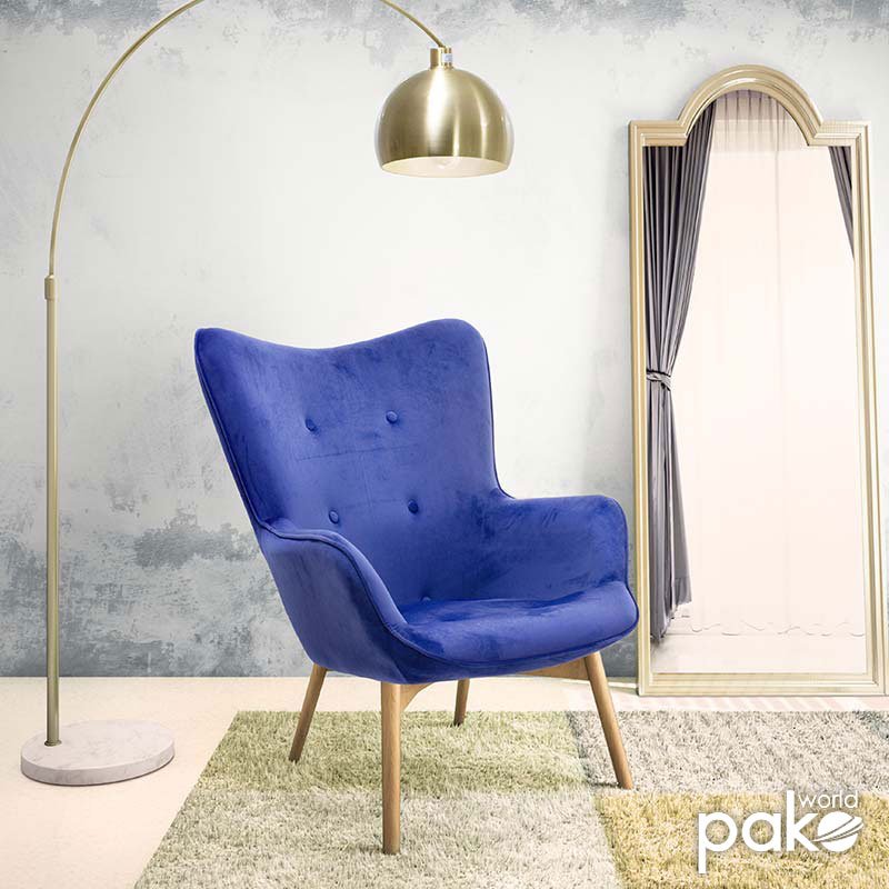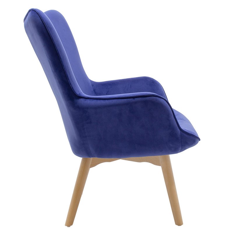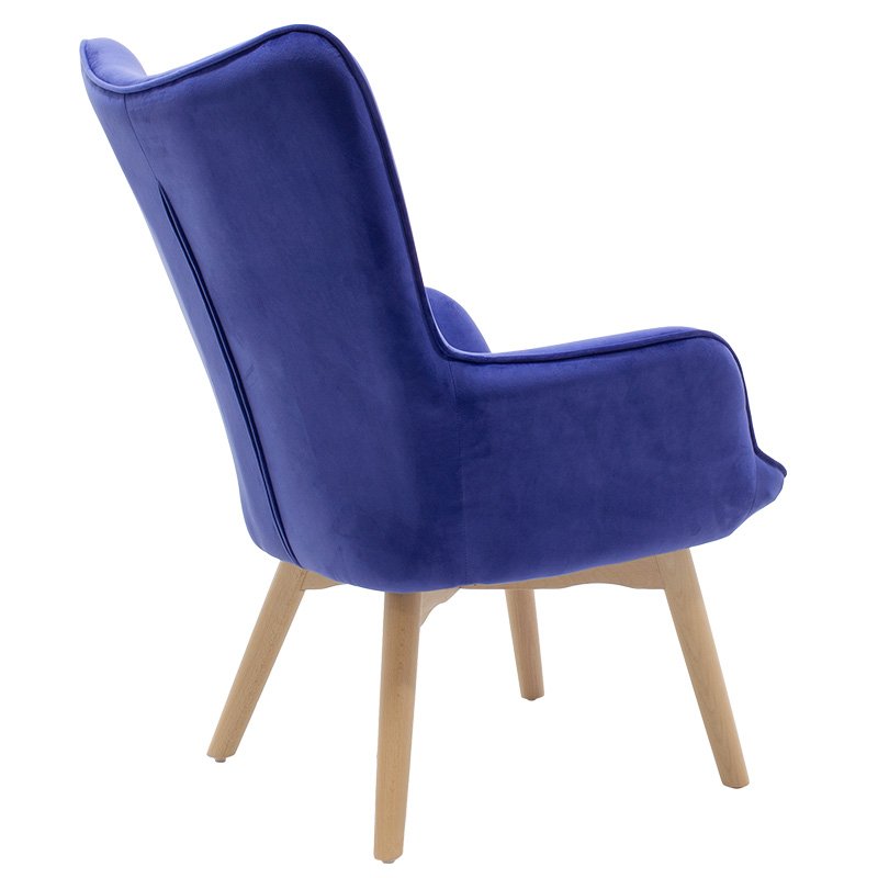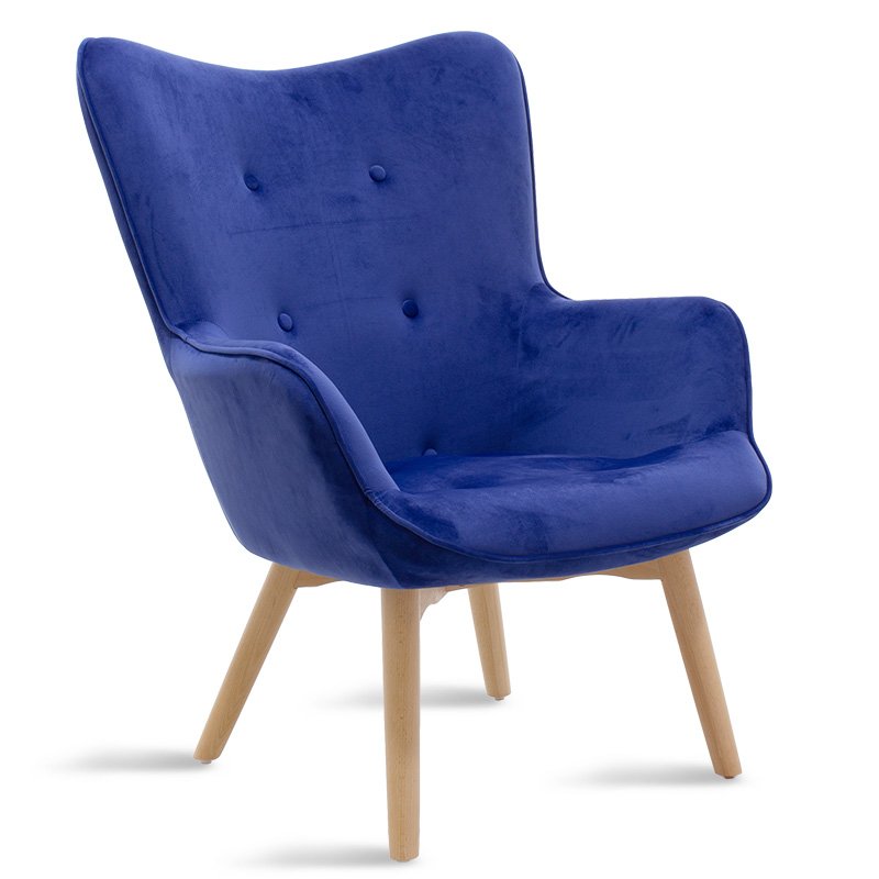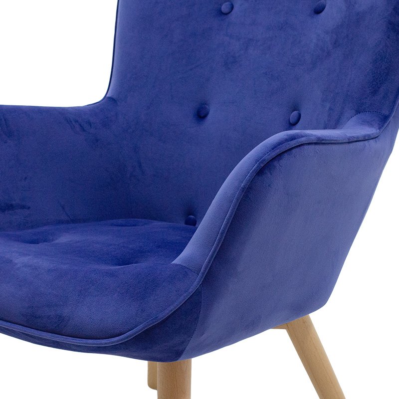 The Kido chair is the contemporary adjustment of Australian design from 1951.  Its base is constructed of solid natural wood. Upholstered in blue velvet, Kido make a style statement in the bedroom or living area with this stand-out design. Featuring sleek tapered wooden legs and a curved design for maximum support, the Kido armchair is a wise investment.Specifications: Construction: Back and seat made from reinforced wooden frame with high durability and resistance to wear. Design: The high back hugs and follows the spine, supporting the waist. It has a modern curved design with decorative studs. Armrests: Integrated armrests for user¢s hand relaxation. Base: Supported on a wooden base ending in four reinforced beech wood legs, of excellent quality and resistant to weight and time. Upholstery: Upholstered with velvet fabric of unrivaled quality, resistant to wear and abrasion. Available in blue color. Protection: The ends of the legs have protective plastic covers to prevent unwanted floor damage.Product Dimensions: Length: 72 cm Width: 75 cm Height: 99 cm Seat Height: 42 cm Seat Length without armrests: 44 cm Seat Depth: 54 cmMaterial Information: Velvet Fabric: Velvet is a fabric with short, dense fibers, usually made from silk, cotton, or synthetic materials. It has a soft, smooth texture and a rich, shiny appearance. It is characterized by its density and softness. Beech Wood: Beech wood comes from the beech tree, a deciduous tree native to Europe and Asia. It is one of the most common hardwoods in Europe and is valued for its hardness, durability, and beauty. Beech wood has a light brown to cream color with a fine, uniform texture. It has tight pores and minimal visible grain, giving it a clean, elegant appearance. Beech wood is also very hard and durable, making it a good choice for furniture and flooring that will withstand heavy use. It is easy to cut, shape, and finish, making it ideal for furniture and other constructions.  Maintenance Instructions: Velvet: Use a soft brush or your vacuum cleaner with the soft brush attachment and gently clean the velvet. In case of a stain, wipe with a soft cloth and lukewarm water, but rub the stain very gently without applying pressure as it will soak deeper. Rinse the area well with clean water and let the fabric dry away from the sun. Beech Wood: Use a soft cloth slightly dampened with water and mild detergent to remove dust and stains from the wood surface. To maintain the natural beauty of the wood and protect it from moisture and wear, you can use special finishing products, such as oils or waxes, which will enhance the wood’s protection and durability.Remarks: The product is delivered unassembled, in factory packaging with a detailed assembly guide. The color shade of the product may differ slightly from the photographic representation on your screen.