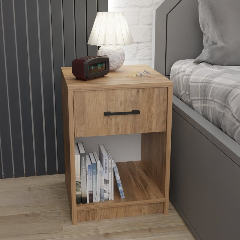 5cmSimple but at the same time elegant and ergonomic, the Ponil bedside table is ideal for those who want furniture that adds something special to the aesthetics of your space.Specifications:* Made of chipboard with melamine coating, highly resistant to wear and tear. Melamine particleboard is a type of wood material that consists of small pieces of wood that have a synthetic coating of melamine. This material is known for its durability and easy maintenance. The melamine surface is smooth and resistant to scratches and bumps, making it suitable for everyday use.* Offered in oak color.Dimension:Length: 41 cm.Width: 41 cm.Height: 54.5 cm.Remarks:The product is delivered unassembled, in factory packaging and with a detailed assembly guide.The color shade of the product may differ slightly from its photographic representation on your screen.