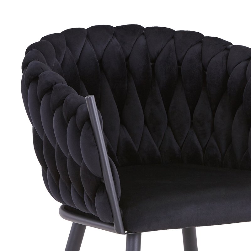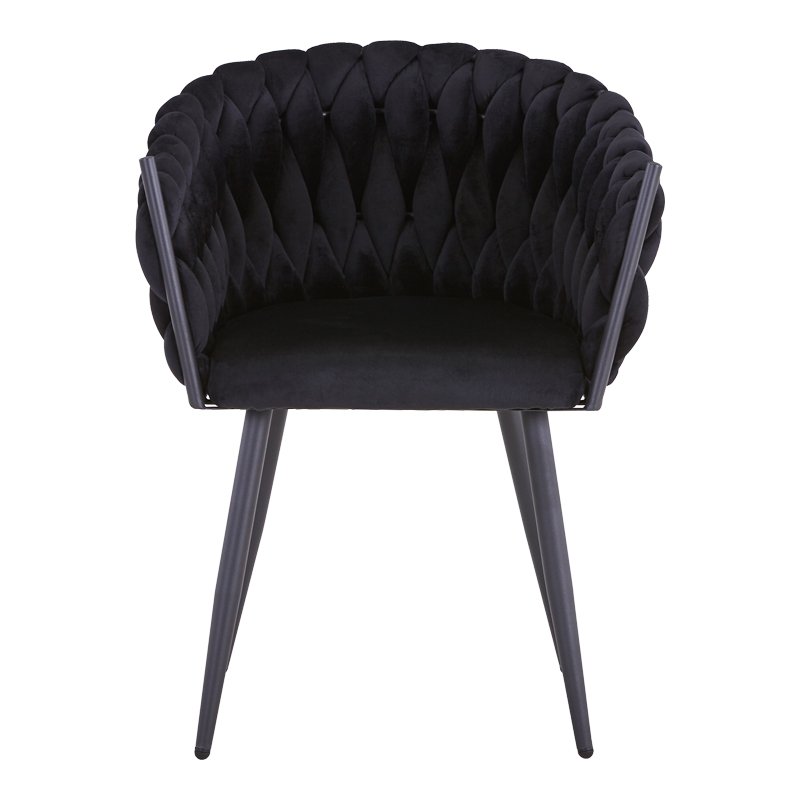 A chair designed to fit any corner of your home.Specifications: Upholstery with high quality black velor fabric. Support on 4 reinforced black metal legs of excellent quality and durability, both in terms of weight and time. The ends of the legs have protective plastic covers to protect the floor from unwanted damage.Product Dimensions: Length: 61 cm. Width: 55 cm. Height: 80 cm. Seat height: 50 cm. Seat depth: 43 cm. Back height: 33 cm. Endurance weight: 150 kg.Material information: Velvet: Velvet is a fabric with short, dense fibers, usually made of silk, cotton or synthetic materials. It has a soft, smooth texture and a rich, glossy appearance. It is characterized by its density and softness. Metal: Metal is widely used in furniture making, offering a number of advantages over other materials. It is extremely wear-resistant, ideal for furniture intended for daily use in a demanding environment. It maintains its shape and structure perfectly, ensuring stability and longevity to the furniture. In addition to the properties mentioned above, the metal may have other characteristics, such as antimicrobial activity (copper) or superconductivity (molybdenum).Maintenance instructions: Velvet: Use a soft brush, or your vacuum cleaner and the attachment with the soft bristles and with gentle movements clean the velvet. In case of a stain, wipe with a soft cloth and lukewarm water, but rub the stain very gently without applying pressure because it will soak in even deeper. Rinse the area thoroughly with clean water and allow the fabric to dry away from the sun. Metal: For any indoor metal, dusting or cleaning with a damp cloth at regular intervals is the appropriate choice.Remarks: The product is delivered unassembled, in factory packaging and with a detailed assembly guide. The color shade of the product may differ slightly from its photographic representation on your screen.