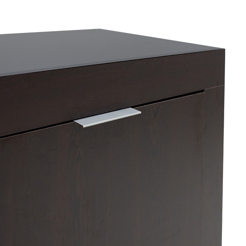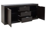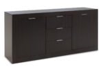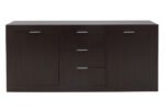 Buffet – Console Doha in Wenge color 180x45x80.5cmDo you love geometric forms, multiple storage spaces, and practicality in a piece of furniture? If so, the Doha buffet will elevate your space’s aesthetics, offering you display and storage areas. A timeless value” decorating proposal for your living room or lounge.Technical specifications: Construction: Made of high-quality 16mm thick melamine, resistant to wear and tear over time. Offered in wenge color. Storage: Includes two symmetrical cabinets (left & right) for storing small items and magazines, and three center drawers with metal sliding guides. Handles: Features stylish and practical aluminum handles.Product dimensions: Length: 180 cm Width: 45 cm + 2.5 cm (for the handles) Height: 80.5 cmMaterial information: Melamine (LPB): LPB (Low Pressure Melamine) is a synthetic material widely used in the surface treatment of chipboard in furniture and surface manufacturing due to its durability and ease of maintenance. It is applied to substrates such as MDF (Medium-density fibreboard) or OSB plywood to produce durable surfaces.Maintenance instructions: Melamine (LPB): To remove stains from the surface, use a soft cloth with lukewarm water and mild soap. Gently wipe the surface until the stain is removed. Melamine is sensitive to moisture, so it is important to protect it from water.Remarks: The product is delivered unassembled, in factory packaging, with a detailed assembly guide. If you need any clarification for the assembly, our experienced technical department is at your disposal to assist you even by phone.”