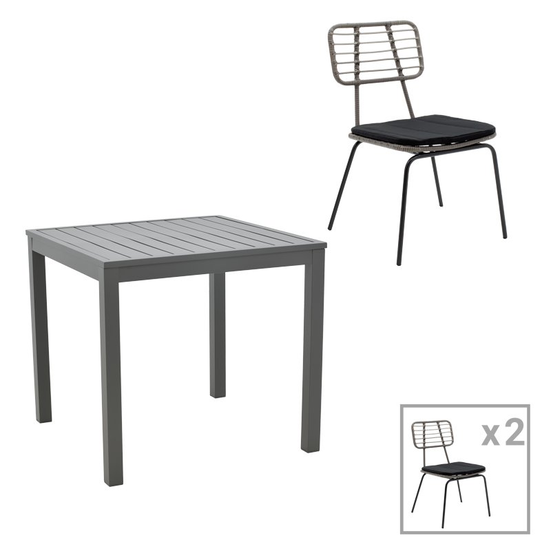 Do you want a durable dining set for your balcony or garden that will aesthetically upgrade your space? The Naoki – Kliton series is ideal for you as it combines aesthetics with quality construction.The set consists of two chairs and a table.Technical characteristics of the table: Aluminum construction. Offered in charcoal color.Table dimensions: Length: 80 cm. Width: 80 cm. Height: 74 cm.Technical characteristics of the chair: Stable frame made of excellent quality metal (legs D50mm) with resistance to stress and wear. Mainly PE rattan seat surface. PE rattan is a kind of ecological synthetic rattan, recyclable and more durable than other kinds. It has a cushion for the seat of the seat 2 cm in white ivory color which has a furrow. Great durability: suitable for outdoor use exposed to weather conditions and humidity. Offered in color: Gray – Black.Chair dimensions: Length: 46.5 cm. Width: 55 cm. Height: 85 cm. Seat height with cushion: 44 cm. Seat height without cushion: 42 cm. Seat depth: 45.5 cm. Back height: 47 cm. Cushion dimensions: 46x2x46Remarks: The product is delivered in factory packaging. The color shade of the product may differ slightly from its photographic representation on your screen.
