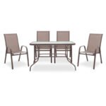 The set consists of four armchairs and a tableTechnical characteristics of the table: Fixed frame made of high quality metal with resistance to stress and wear. It has rounded corners to avoid injuries. Mainly tempered glass table surface 5mm – transparent waterwave. High durability: suitable for outdoor use exposed to weather and humidity. Available in brown.Product dimensions: Length: 120 cm Width: 70 cm Height: 70 cmTechnical characteristics of the chair: Stable metal frame with resistance to stress and wear. Main chair body made of excellent quality textilene. Textilene is a fabric of high resistance to sunlight and moisture while leaving the skin to breathe” thus creating comfort in the seat. High durability: suitable for outdoor use exposed to weather and humidity. Stackable: offers ease of transport and storage. Available in brown.Product dimensions: Length: 55 cm Width: 75 cm Height: 90 cm Seat height: 43 cm Endurance weight: 160kgs Comments: The chairs are delivered assembled while the table needs assembly. The color of the product may differ slightly from the photo display on your screen. “