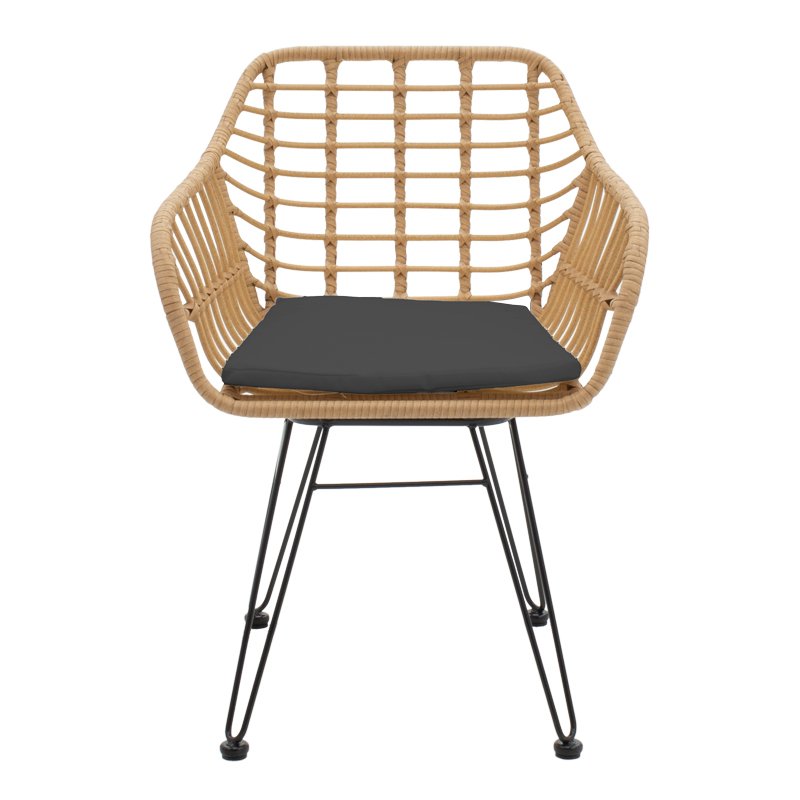 Dining table Naoki II modeliny set of 5 natural rattan-black metal-glass 160x90x78cmDo you want a durable dining set for your balcony or garden that will aesthetically upgrade your space? The Naoki series is ideal for you as it combines aesthetics with quality construction.The set includes four armchairs and a table.Technical characteristics of the table:* Stable frame made of excellent quality metal (legs D50mm) with resistance to stress and wear.* Mainly PE rattan table top. PE rattan is a kind of ecological synthetic rattan, recyclable and more durable than other kinds.* Glass: tempered glass 6mm – transparent.* Great durability: suitable for outdoor use exposed to weather conditions and humidity.* Offered in color: Natural – Black.Product dimensions:Length: 160 cmWidth: 90 cmHeight: 78 cmArmchair technical characteristics:* Stable frame made of excellent quality metal with resistance to stress and wear.* Mainly PE rattan chair surface in natural color. PE rattan is a kind of ecological synthetic rattan, recyclable and more durable than other kinds.* Comes with a black seat cushion which has a zipper.* Great durability: suitable for use outdoors exposed to weather conditions and humidity.* The ends of the support legs have plastic covers to protect the floor from unwanted damage.* Offered in black-natural color.Product dimensions:Length: 55 cmWidth: 58 cmHeight: 79 cmSeat height: 43 cmEndurance weight: 150 kgRemarks:The product is delivered in factory packaging.The color shade of the product may differ slightly from its photographic representation on your screen