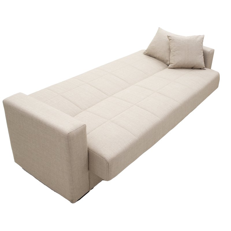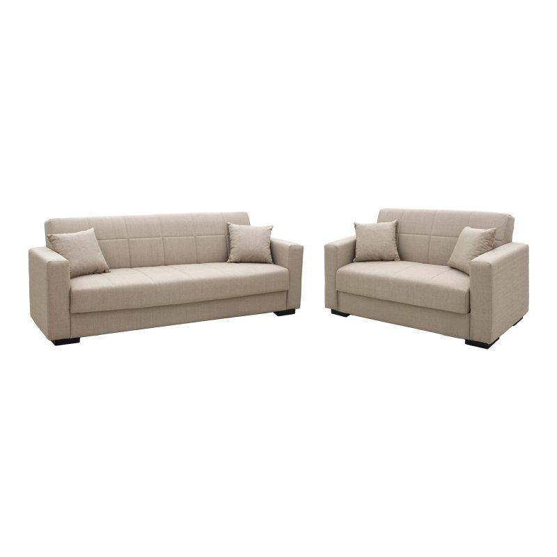 A jewelry living room set, of large dimensions, of exceptional durability and of Greek manufacture.The set consists of two pieces:1. Vox modeliny three-seater sofa-bed with storage cream fabric 214x82x83cmSpecifications: Reinforced frame made of excellent quality metal with great resistance to wear and use.  Upholstered sofa with fabric of unrivaled quality and reinforcement inside with soft sponges for a comfortable seat. Offered in cream color.  It has an easy-to-use mechanism that lifts up with a single movement, turning the sofa into a bed and vice versa. The sofa has elegant plastic legs for the best possible support made of highly durable metal which are equipped with protective covers to protect the floor from unwanted damage.  It has a storage space for closed organization and storage of your items. Sofa dimensions: Length: 214 cm. Width: 82 cm. Total height: 83 cm. Internal length: 180 cm. Seat height: 47 cm. Seat depth: 55 cm. Back height: 41 cm. Leg height: 10 cm. Arm height: 65 cm. Arm height from seat: 16 cm. Arm length: 16 cm. Arm width: 66 cm. Bed dimensions: 106×180 cm.  2. Sofa-bed with storage two-seater Vox modeliny cream fabric 154x82x80cmSpecifications: Reinforced frame made of excellent quality metal with great resistance to wear and use. Upholstered sofa with fabric of unrivaled quality and reinforcement inside with soft sponges for a comfortable seat. Offered in cream color. It has an easy-to-use mechanism that lifts up with a single movement, turning the sofa into a bed and vice versa. The sofa has elegant plastic legs for the best possible support made of highly durable metal which are equipped with protective covers to protect the floor from unwanted damage. It has a storage space for closed organization and storage of your items. Sofa dimensions: Length: 154 cm. Width: 82 cm. Total height: 83 cm. Inner length: 120 cm. Seat height: 47 cm. Seat depth: 55 cm. Back height: 41 cm. Leg height: 10 cm. Arm height: 65 cm. Arm height from seat: 16 cm. Arm length: 16 cm. Arm width: 66 cm. Bed dimensions: 106×120 cm. Material information: Metal: Metal is widely used in furniture making, offering a number of advantages over other materials. It is extremely wear-resistant, ideal for furniture intended for daily use in a demanding environment. It maintains its shape and structure perfectly, ensuring stability and longevity to the furniture. In addition to the properties mentioned above, the metal may have other characteristics, such as antimicrobial activity (copper) or superconductivity (molybdenum).    PP: Polypropylene (PP), is a thermoplastic material widely used in many fields due to its excellent properties. Although it is lightweight, it has high impact resistance, making it suitable for applications that require shock and abrasion resistance. It maintains its properties even under the influence of humidity, making it suitable for applications in environments with high humidity. Fabric: Fabric is a versatile material made by weaving, knitting, stitching or bonding fibers. These fibers can be natural, such as cotton, wool or silk, or synthetic, such as polyester or nylon. The weaving of the fibers creates a network that gives the fabric its properties such as strength, softness, breathability and elasticity. There are endless varieties of fabrics, each with their own unique characteristics and uses.  Maintenance instructions: Metal: If it’s any indoor metal, a regular dusting or cleaning with a damp cloth is the way to go.    PP: For daily cleaning of polypropylene, use a soft cloth or sponge, lightly dampened with mild detergent and warm water. Spread the cloth over its surface and clean by applying light pressure. Fabric: The maintenance of fabric depends on several factors, such as the type of fiber, the construction of the fabric and its use. Use a mild detergent that is suitable for the type of fabric. Avoid using bleach or bleach as they can damage the fibers.  Remarks: The product is delivered in factory packaging and with a detailed assembly guide.    The color shade of the product may differ slightly from its photographic representation on your screen.