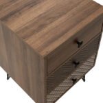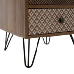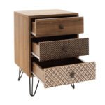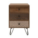 modeliny Boho bedside table with 3 drawers walnut with metal legs 40x40x59cmIs elegance, quality and impressive design your style? And are you tired of the same things? If so, then the Boho bedside table is for you. With a modern design, durable materials and three drawers for storing your favorite accessories. An ideal decoration proposal for the aesthetic renewal of your space.Technical specifications: Construction: Constructed from high-quality chipboard with paper wood veneer, providing durability against wear, damage, and time. Available in walnut color with multiple geometric patterns. Legs: Features aesthetically pleasing black metal legs that elegantly elevate and accentuate the furniture, offering excellent support. Composition: Includes three drawers that can be arranged in any desired order. Product dimensions: Length: 40 cm Width: 40 cm Height: 59 cm Leg height: 14 cm Nightstand height without legs: 45 cmMaterial information: Chipboard: Chipboard, also known as particleboard, is a composite wood material manufactured from small wood particles, usually pine or spruce, bonded together under high pressure and temperature using resins. Widely used in furniture construction, interior surfaces, and structural applications. Made from recycled materials, it is resistant to curves, abrasions, and other natural wear. LPL Decor Paper: LPL (Low-Pressure Laminate) Decor Paper is a material extensively used for decorating surfaces such as furniture, doors, floors, and other interior surfaces. It is a type of decorative paper impregnated with resins to provide durability and glossiness. Applied to substrates such as MDF (Medium-density fibreboard) or plywood and processed under low pressure and heat to produce products like furniture surfaces. Available in a wide range of colors, designs, and textures, it can mimic natural materials such as wood, marble, and granite. Metal: Metal is widely used in furniture manufacturing, offering a range of advantages compared to other materials. It is highly resistant to wear and tear, making it ideal for furniture intended for everyday use in demanding environments. It maintains its shape and structure perfectly, ensuring stability and longevity for the furniture. In addition to the properties mentioned above, metal can have other characteristics, such as antimicrobial action (copper) or conductivity (lead).Maintenance instructions: Chipboard: For cleaning chipboard, you can use a soft cloth lightly dampened with water and mild detergent. Avoid excessive water usage and keep the surface dry after cleaning. LPL Decor Paper: Surfaces with LPL coating are easy to clean with mild detergents and a soft cloth. It is recommended to avoid contact with liquid elements. Metal: For any indoor metal, dusting or cleaning with a damp cloth at regular intervals is the recommended option. However, foroutdoor metal furniture, follow these steps for better maintenance: For extended protection, apply protective cream to your metal furniture, easily available from commercial stores. If your furniture is treated and painted with the powder-coating method, it is highly durable and can be easily cleaned with a damp cloth. If your metal furniture does not have powder coating, take extra care and keep it away from water and moisture. You can cover them with special covers, and during winter, if possible, place them indoors. If you notice rust, remove it with kerosene and then apply anti-corrosion varnish before painting the surface with rust-resistant paint. Remarks: The product is delivered unassembled, in factory packaging, and with detailed assembly instructions. The color shade of the product may slightly differ from its photographic representation on your screen.