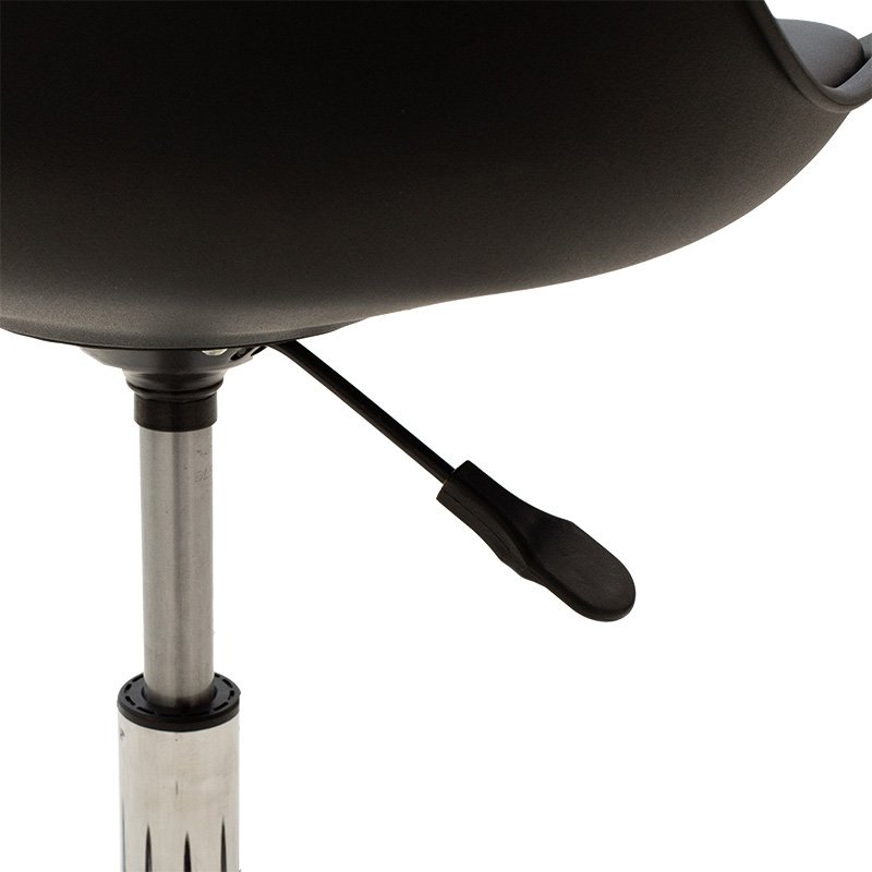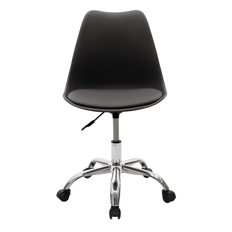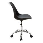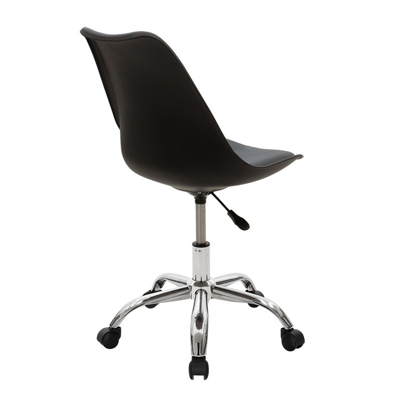 Office chair Gaston II modeliny PP-PU in black colorDo you want to renew your space with a seat of exceptional quality and durability, in retro style? If so, the Gaston II chair is what you are looking for. Made with modern recyclable durable materials, it offers you the ergonomics and quality of today, giving you at the same time the design of another era. Ideal for both home and office.Technical Specifications: Back made of polypropylene, with high durability and wear resistance, 100% recyclable material. Follows the spine supporting the waist with a curved finish at the top, offered in black. Basic Mechanism: Height adjustment with the ability to adjust and lock” the seat in the appropriate ergonomic position, depending on the height of the user. According to the correct ergonomics the legs should form a right angle 90o with the floor. Durable metal frame: Mounted on a wheeled pentagonal curved metal base of high strength chrome. Ability to easily rotate and move in any direction. Pu Technoderma: Lining with high quality technoderma that provides durability over time and the possibility of easy cleaning. Available in black. Low back design that supports the spine. Reinforced support bottle Product Dimensions: Length: 48 cm. Width: 57 cm. Height: 80-93 cm. Seat height: 46-60 cm.Material Information: PP – Polypropylene: Polypropylene (PP) is a thermoplastic material widely used in many industries due to its exceptional properties. Despite being lightweight, it has high impact resistance, making it suitable for applications requiring durability against impacts and abrasion. It retains its properties even under moisture exposure, making it suitable for use in high humidity environments. Metal: Metal is widely used in furniture construction, offering several advantages over other materials. It is extremely resistant to wear, ideal for furniture intended for daily use in a demanding environment. It maintains its shape and structure perfectly, ensuring stability and longevity. Besides the properties mentioned above, metal can also have other characteristics, such as antimicrobial action (copper) or superconductivity (molybdenum). PU (Polyurethane) Leatherette: PU is an imitation leather and usually refers to polyurethane, a polymer material widely used in many fields due to its excellent properties. It has satisfactory durability, easy cleaning, waterproofing, does not deform, and is environmentally friendly. Maintenance Instructions: PP (Polypropylene): For everyday cleaning of polypropylene, use a soft cloth or sponge lightly dampened with mild detergent and warm water. Gently wipe the surface to clean. Metal: For any indoor metal, dusting or wiping with a damp cloth regularly is recommended. However, for outdoor metal furniture, follow these steps: For extended protection, apply protective cream, easily available in stores, to your metal furniture. If your furniture is processed and painted with powder-coating, it is very durable and can be cleaned easily with a damp cloth. If your metal furniture is not powder-coated, you need to be more careful and keep it away from water and humidity. You can cover them with special covers and, if possible, place them indoors during winter. If you notice rust, remove it with turpentine, then apply anti-rust varnish before painting the surface with oxidation-resistant paint. PU Leatherette: Use a soft cloth to remove any dust from the surface. For stains, use warm water and mild soap and wipe the area. Always dry the surface afterward with a dry cloth to avoid watermarks. Remarks: The product is delivered unassembled, in factory packaging, and with detailed assembly instructions. The color shade of the product may slightly differ from its photographic representation on your screen.”