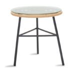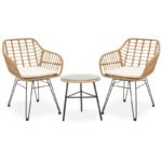 Do you want a durable living room set for your balcony or garden that will aesthetically upgrade your space? The Gaus-Naoki range is ideal for you as it combines aesthetics with build quality.The set includes two armchairs and a tableTechnical Specifications: Stable frame made of high quality metal (legs D50mm) with resistance to stress and wear. Mainly surface made of PE rattan. PE rattan is a type of ecological synthetic rattan, recyclable and more durable than other species. Includes a cushion for the seat 2cm in white ivory color which has a zipper. Glass: tempered glass 5mm – transparent. High durability: suitable for outdoor use exposed to weather and humidity. Available in color: Natural – Black.Product Dimensions:Table dimensions: Diameter: 46 cm Height: 45 cmArmchair dimensions: Length: 59 cm Width: 57 cm Height: 81 cm Seat height: 43 cmMaterial Information: PE Rattan: PE rattan, a popular material that mimics natural rattan, is commonly used in the construction of furniture and accessories. Made from polyethylene, a durable synthetic polymer resin, PE rattan is weather-resistant and does not degrade from exposure to sun or rain. It retains its color and does not fade, making it an excellent choice for both indoor and outdoor use. Additionally, PE rattan is environmentally friendly, contributing to sustainable practices in manufacturing and product longevity. Tempered glass – Safety glass: Tempered glass, also known as toughened or thermally processed glass, is a type of safety glass that has undergone special treatment to increase its strength compared to ordinary glass. The thermal processing involves heating the glass to a high temperature and then rapidly cooling it. This creates a compression stress on the surface of the glass and a tensile stress inside, making it more resistant to impacts, thermal shocks, and scratches. It is about 5 times more impact-resistant than ordinary glass. A significant advantage is that in case of breakage, tempered glass shatters into small, blunt fragments, reducing the risk of serious injury. It is used in tables, desks, TV furniture, etc. Metal: Metal is widely used in furniture construction, offering several advantages over other materials. It is extremely resistant to wear, ideal for furniture intended for daily use in a demanding environment. It maintains its shape and structure perfectly, ensuring stability and longevity. Besides the properties mentioned above, metal can also have other characteristics, such as antimicrobial action (copper) or superconductivity (molybdenum). Fabric cushion: Fabric is a versatile material made by weaving, knitting, stitching, or bonding fibers together. These fibers can be natural, such as cotton, wool, or silk, or synthetic, such as polyester or nylon. The weaving of fibers creates a network that gives the fabric its properties, such as strength, softness, breathability, and elasticity. There are countless varieties of fabrics, each with its own unique characteristics and uses.Maintenance Instructions: PE Rattan: This material is easy to maintain and clean. Simply wash it with water and mild soap. Use a soft brush or cloth to gently scrub away dirt and debris. Rinse thoroughly with clean water and allow it to air dry. Regular cleaning will help maintain its appearance and extend its lifespan. Tempered glass: Initially, use a soft damp cloth and a mild detergent or just water. Apply the cloth to the tempered glass and clean it with gentle circular motions. Avoid using excessive pressure and materials that may cause scratches. Metal: For any indoor metal, dusting or wiping with a damp cloth regularly is recommended. However, for outdoor metal furniture, follow these steps: For extended protection, apply protective cream, easily available in stores, to your metal furniture If your furniture is processed and painted with powder-coating, it is very durable and can be cleaned easily with a damp cloth. If your metal furniture is not powder-coated, you need to be more careful and keep it away from water and humidity. You can cover them with special covers and, if possible, place them indoors during winter. If you notice rust, remove it with turpentine, then apply anti-rust varnish before painting the surface with oxidation-resistant paint. Fabric cushion: The maintenance of fabric depends on various factors such as the type of fiber, fabric construction, and its use. Use a mild detergent that is suitable for the type of fabric. Avoid using bleach or whitening agents, as they can damage the fibers. Remarks: The product is delivered in factory packaging. The table needs to be mounted and comes with a detailed assembly guide and the chairs only require screwing on the legs. The color shade of the product may vary slightly from the photographic representation on your screen.