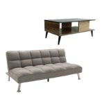 A student furniture set that will make your dream come true and help you in your new beginning.The student package includesRebel modeliny 3-seater sofa-bed with gray fabric 189x92x82cmSpecifications: Built internally from a reinforced frame for greater resistance to weight and durability over time. It has an easy-to-use click-clack” metal mechanism that, with a single movement, turns the sofa into a bed and vice versa. Upholstery with high quality and durable fabric with soft texture in gray color. The back can recline the entire sofa and can also stand in an intermediate position for more moments of relaxation. Square design with reinforced quilted back and seat cushions. The sofa has 4 elegant chrome legs and a central one for the best possible support and protection of the floor from unwanted damage.Product Dimension:Sofa Dimension: Length: 189 cm. Width: 92 cm. Height: 82 cm. Leg height: 20 cm. Bed Dimension: Length: 189 cm. Width: 110 cm. Height: 40 cm. Coffee table Naya modeliny natural-charcoal 93x46x43cmSpecifications: Stable frame made of high-quality chipboard with paper wood lining with resistance to wear and time and durable MDF. It has a shelf with dividers for open storage of your items but also for placing decorative compositions of your choice. Offered in the color of natural – charcoal. Product Dimension: Length: 93 cm. Width: 46 cm. Height: 43 cm. Material information: Fabric: Fabric is a versatile material made by weaving, knitting, stitching or bonding fibers. These fibers can be natural, such as cotton, wool or silk, or synthetic, such as polyester or nylon. The weaving of the fibers creates a network that gives the fabric its properties such as strength, softness, breathability and elasticity. There are endless varieties of fabrics, each with their own unique characteristics and uses. Metal: Metal is widely used in furniture making, offering a number of advantages over other materials. It is extremely wear-resistant, ideal for furniture intended for daily use in a demanding environment. It maintains its shape and structure perfectly, ensuring stability and longevity to the furniture. In addition to the properties mentioned above, the metal may have other characteristics, such as antimicrobial activity (copper) or superconductivity (molybdenum). Melamine (LPB): Melamine LPB (Low Pressure Melamine) is a synthetic material widely used in the surface treatment of chipboard in the manufacture of furniture and surfaces, due to its durability and ease of maintenance. It is applied to substrates such as MDF (Medium-density fibreboard) or OSB plywood to produce durable surfaces. Chipboard: Chipboard, known as chipboard, is a composite wood material made from small pieces of wood, usually pine or spruce, glued together under high pressure and temperature using resins. It is widely used in the manufacture of furniture, interior surfaces and structural applications. It is made from recycled materials and is resistant to bends, abrasions and other natural stresses. MDF (Medium-density fibreboard): MDF (Medium-density fibreboard) is a wood derivative. For its production, resins (glues) are used to weld the wood fibers which are compressed with special heated presses. It is denser than chipboard and durable. It also does not absorb any moisture. Maintenance instructions: Fabric: The maintenance of fabric depends on several factors, such as the type of fiber, the construction of the fabric and its use. Use a mild detergent that is suitable for the type of fabric. Avoid using bleach or bleach as they can damage the fibers. Metal: If it is any metal interior, a dusting or cleaning with a damp cloth at regular intervals is the appropriate choice. Melamine (LPB): To remove stains from the surface use a soft cloth with warm water and mild soap. Gently wipe the surface until the stain is removed. Melamine is sensitive to moisture, so it is important to protect it from water. Chipboard: To clean the chipboard, you can use a soft cloth slightly soaked in water and mild detergent. Avoid excessive use of water and keep the surface dry after cleaning. MDF: To clean it use a soft dry cloth to remove dust and dirt. For stains use a soft cloth with lukewarm water and mild soap. Gently wipe the surface until the stain is removed. Finally, wipe the surface well with a dry cloth. MDF is sensitive to moisture, so it is important to protect it from moisture. Wipe up any liquids immediately. Do not use strong cleaners or chemicals as they may damage the MDF. Remarks: The products are delivered unassembled, in factory packaging and with a detailed assembly guide. The color shade may differ slightly from its photographic representation on your screen. “