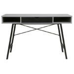 Yamin modeliny work desk gray cement-black 120x48x76cmOffice with a modern design that combines functionality with durability. It has useful storage spaces and is adaptable as reception furniture at home or in the business area.Specifications:Frame made of chipboard with high resistance melamine coating, color: gray cement.Support on black metal legs.Practical and modern style with storage spaces: Two shelves and one drawer.Composition dimensions:Length: 120 cmWidth: 48 cmHeight: 76 cmRemarks:The product is delivered in factory packaging and with a detailed assembly guide.The color shade of the product may differ slightly from its photographic representation on your screen